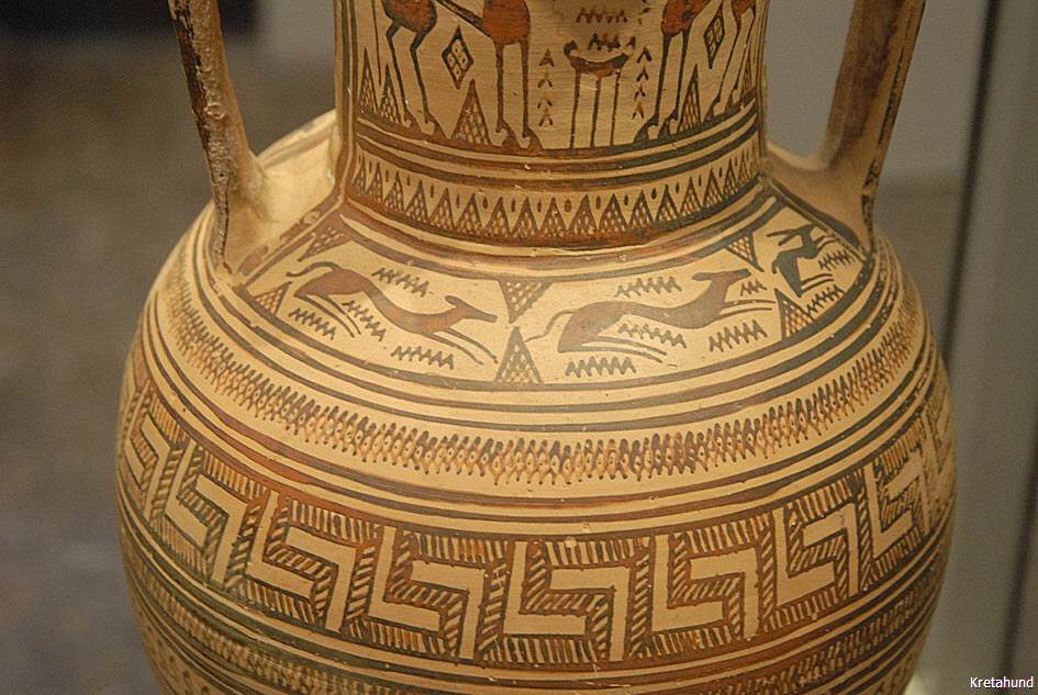 Von 1100 v.Chr. bis 480 v.Chr. beherrschen die Dorer die Insel, die Eteokreter (echten Kreter) ziehen sich in die abgelegenen Bergregionen im Osten der Insel zurück. Das interessanteste Fundstück einer Hundedarstellung aus der sogenannten Geometrischen Epoche Kretas (900-650 v. Chr.) ist eine Metallklinge, die in der Ida-Höhle im Psiloritis-Gebirge gefunden wurde und heute im Museum von Iraklion zu sehen ist (Saal 121, Vitrine 169). In der Nekropole von Orthi Petra bei Eleftherna (900-680 v.Chr.) wurde bei Grabungen unter der Leitung von Prof. Nikos Stampolidis das Skelett eines Hundes gefunden, das alle Merkmale des Kritikos Lagonikos aufweist. Es lag direkt neben der Amphore mit dem Skelett eines etwa 15 Jahre alten Jungen.