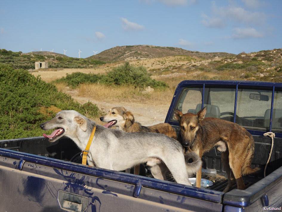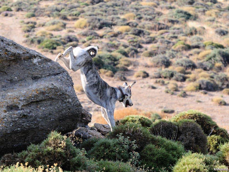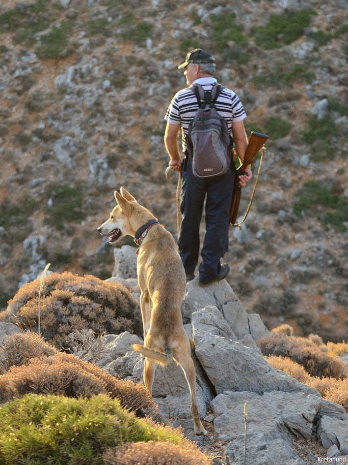 Die Hasenjagd auf Kreta stellt aufgrund der extremen Geländeverhältnisse und des Klimas besonders hohe Anforderungen an die Hunde. Die Härte und Schärfe, die sie dabei an den Tag legen, steht in krassem Gegensatz zu ihrem sonstigen Verhalten. Während der Jagsaison von Mitte September bis in den April fahren die Jäger mit einem oder zwei Hunden in abgelegene Gebirgsregionen. Gelegentlich werden zusätzlich junge Hunde zur Ausbildung mitgenommen. Die Jagd beginnt im Morgengrauen und dauert viele Stunden, oft bei Temperaturen um die 40°. Die Hunde jagen mit allen Sinnen. Der Jäger postiert sich meistens auf einem Felsen und kann von dort seine Hunde, die immer wieder Blickkontakt mit ihm aufnehmen, durch optische und verbale Signale aus großer Entfernung führen. Sie suchen mit der Nase die Spur des Hasen, der sich in Felsspalten oder im Dornengestrüpp versteckt. Dabei verfolgen sie ohne Spurlaut die frischeste Fährte, die direkt zum Versteck des Hasen führt. Die Hunde arbeiten ruhig und leise, sie dürfen bei aller Jagdmotivation nicht hektisch werden, sondern müssen sich konzentrieren, um keine Energie zu verschwenden. Die trockene Witterung, die hohen Temperaturen und der oft sehr starke Wind erschweren das Auffinden der Beute, da die Duftmoleküle, vor allem auf dem kahlen Fels, rasch zerstört werden. Ein großes Problem stellt auch der Staub dar, den die Hunde zwangsläufig mit der Nase aufnehmen und der somit Geruchssinn und Atmung beeinträchtigt und die Hunde zu häufigem Niesen zwingt. Der Kritikos Lagonikos verfügt jedoch über eine Jagdtaktik, die von den Kretern "Anemistos" genannt wird. Es bedeutet "mit dem Wind - Erfassen der Luft". Dazu bleiben die Hunde stehen, nehmen die Nase hoch, stellen sich manchmal auch auf die Hinterbeine und bewegen sich gegebenenfalls im Kreis. Sie saugen den Geruch der Beute mit Nase und oft leicht geöffnetem Fang ein und orten so die Beute. Man kann gut sehen, wie sie dabei die "Backen aufblasen" und den Geruch regelrecht "kauen". Eine weitere erfolgreiche Taktik besteht im Belecken des Untergrundes, um die wenigen noch vorhandenen Reste der Fährte besser aufnehmen zu können. Am lebhaften Rutenspiel der Hunde erkennt der Jäger, wenn sich die Beute in unmittelbarer Nähe befindet. Mit gespitzten Ohren lauschen sie auf jede Regung ihres Opfers. Währenddessen kommunizieren die Hunde über ihr Rutenspiel miteinander, und das plötzliche Erstarren eines Hundes, mit hoch aufgeringelter Rute, zeigt dem Jäger, daß das Versteck gefunden wurde. Wenn der Hase aufgejagt worden ist, beginnt die Hatz über scharfkantige Felsen und dornigem Bewuchs, wobei kurz der "Kampfschrei", ein hohes Bellen, zu hören ist. Dabei vollführen die Hunde atemberaubende Sprünge und Wendungen, um dem hakenschlagenden Hasen den Weg abzuschneiden. Oft müssen tiefe Schluchten und meterhohe glatte Felswände überwunden werden. Mit Eleganz und Leichtigkeit bewegen sich die Hunde in dem schwierigen Gelände und erreichen dabei auf kurzen Distanzen Geschwindigkeiten von ca. 70 km/h. Die Hunde arbeiten miteinander und die Erfahrung lehrt sie "wie der Hase läuft". Wenn es ihnen nicht gelingt, den Hasen auf den ersten 100 metern im Lauf zu packen, verfolgen sie ihn noch ca. 500 bis 1000 meter und kehren dann zum Jäger zurück. Die Hunde wissen aus Erfahrung, dass ihre Chancen mit der Entfernung geringer werden und begeben sich auf eine neue Suche. Wenn ein Hund die Beute gefasst hat, apportiert er sie seinem Herrn, ohne daß die anderen Hunde versuchen, sie ihm streitig zu machen. Die traditionelle Jagdweise ohne Gewehr ist heute nicht mehr erlaubt. Die Jäger müssen über viel Erfahrung und gutes Timing verfügen, um den Hund beim Schuß nicht zu verletzen, da dieser sich sehr nah hinter der Beute befindet, und oft hat der Hund den Hasen bereits gefangen, bevor der Jäger die Möglichkeit zum Schuß hat.