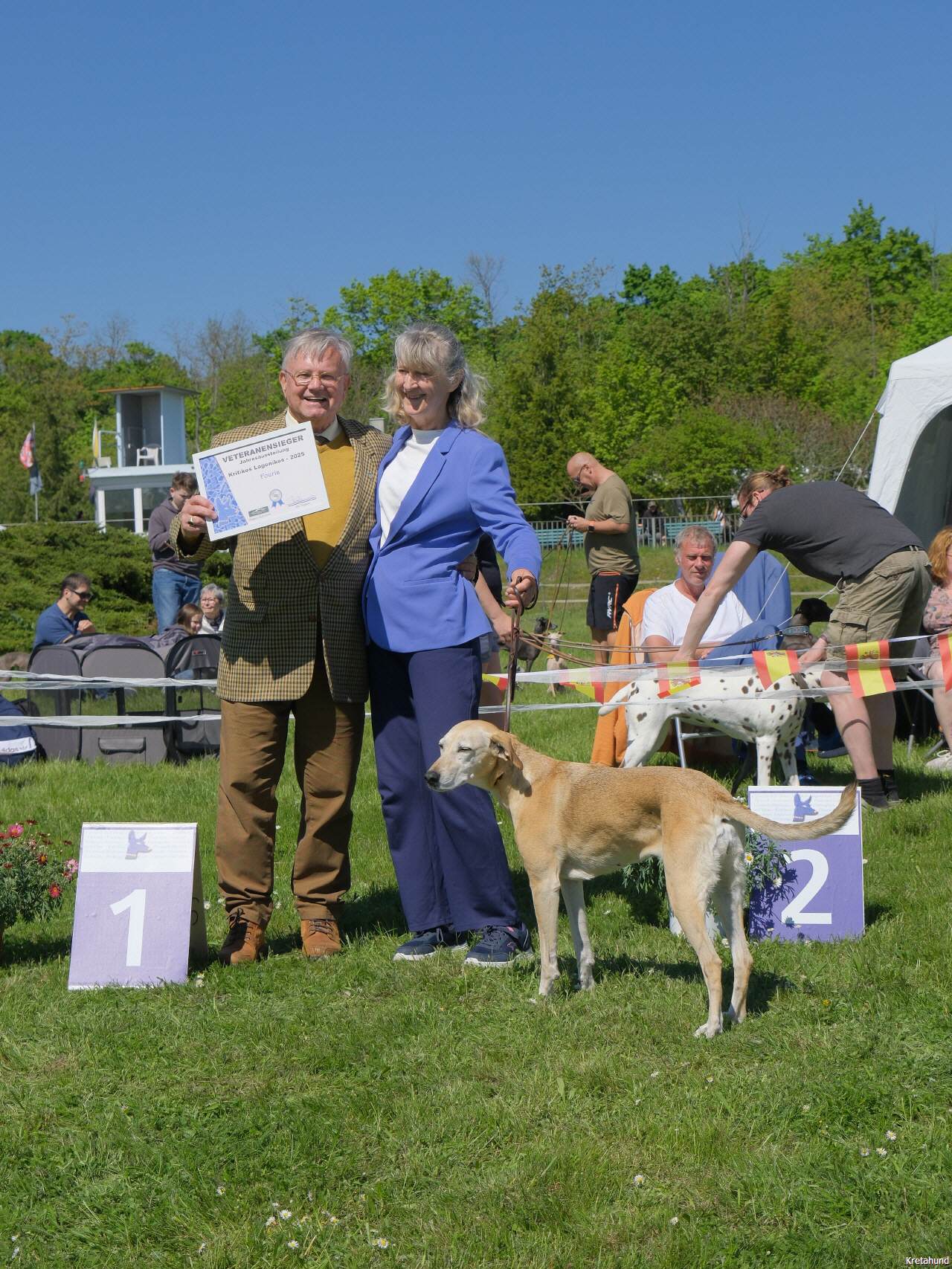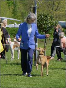 In diesem Jahr fand die Jahresausstellung der mediterranen Rassen auf der Windhundrennbahn in Greppin statt. Bei einer Meldezahl von 28 Hunden waren, mit Ausnahme des Podengo Portugues, alle Rassen der vom DWRV betreuten Rassen der Gruppe 5 vertreten. Der sympathische und humorvolle Zuchtrichter Jan Coppens aus den Niederlanden nahm die Bewertung der ausgestellten Hunde mit großer Sorgfalt und viel Einfühlungsvermögen vor und offenbarte großes Interesse und Sachkenntnis auch beim Kritikos Lagonikos. Er ließ es sich im Ehrenring nicht nehmen, das Publikum über die Herkunft und die Besonderheiten dieser Rasse zu infomieren.