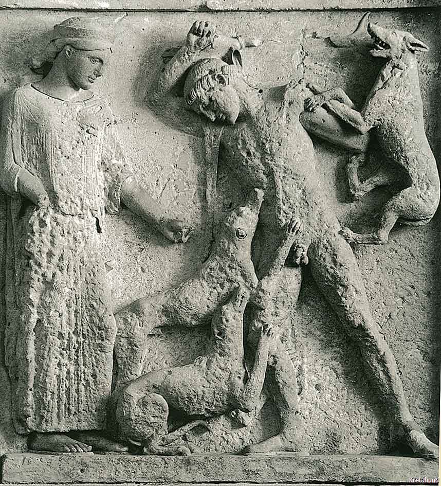 Obwohl Zeus mit seiner Schwester Hera vermählt war, hatte er viele Liebschaften, sowohl unter den Göttinnen, als auch unter den sterblichen Menschen. Als er die schöne phönizische Prinzessin (oder Göttin) Europa traf, verwandelte er sich in einen imposanten weißen Stier und verleitete sie dazu, sich auf seinen Rücken zu schwingen. Sofort sprang er ins Meer und schwamm mit ihr nach Kreta. Am Strand von Matala angekommen, nahm er die Gestalt eines Adlers an und verführte sie unter der immergrünen Platane bei Gortys. Drei Söhne entsprangen dieser Verbindung: Minos, Sarpedon und Rhadamanthis, die sich als Könige die Herrschaft über die Insel Kreta teilten, und Zeus machte seiner Geliebten Europa zum Abschied drei Geschenke. Er überließ ihr den Wächter Kretas, den Riesen Talos, der aus Erz gefertigt war und dessen Name in der alten Kretischen Sprache die Sonne bedeutete, und schenkte ihr einen Speer, der niemals sein Ziel verfehlte. Die dritte Gabe des Gottes an Europa war ein goldener Kretischer Jagdhund, von dem es hieß, daß seine Beute ihm niemals entkam. Er war ein Wunderwesen, in der Werkstatt des Schmiedegottes Hephaistos entstanden und hatte die Wiege des Zeuskindes und später sein Heiligtum bewacht.