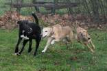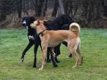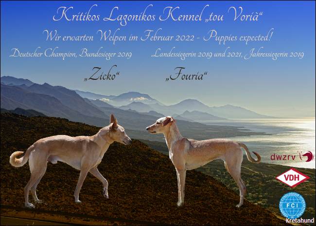 Als wir 2007 unsere Hündin Synnefia bekamen, war eigentlich klar: Wir möchten auch eines Tages einen Wurf Kritikos Lagonikos - Welpen aufziehen. Den passenden Rüden hatten wir bereits, Dhias (Krikyon Apollon) war in Griechenland für die Zucht anerkannt. Nachdem auch Synnefia ihre Anerkennung hatte, und einem Zuchtvorhaben eigentlich nichts mehr im Wege stand, beantragte ich 2011 als Mitglied des Deutschen Windhundzucht- und Rennverbandes DWZRV im VDH den nationalen Zwingerschutz und auch den internationalen Zwingerschutz für alle Rassen bei der FCI. Der Name unserer Zuchtstätte war schnell gefunden: "vom Nordwind" sollte sie heißen. Da der Nordwind in Griechenland "Vorias" heißt (Βοριάς) und für eine griechische Hunderasse natürlich nur ein griechischer Zwingername infrage kommt, wurde es also "του Βοριά", oder in lateinischen Buchstaben: "tou Voria". Leider hatten wir nicht das Glück, Nachwuchs von Synnefia und Dhias zu bekommen. Synnefia ließ sich von Dhias, mit dem sie in unserem kleinen "Rudel" aufgewachsen war, nicht decken. Ein anderer Rüde stand uns nicht zur Verfügung. Als Dhias dann 2014 plötzlich nach einer Milzruptur verstarb, mußten wir die Hoffnung auf Welpen aufgeben. Aber nun haben wir Fouria - und in Deutschland gibt es einen perfekt geeigneten Rüden: Zicko, geboren in Koutsouras im Osten Kretas, Besitzerin Svea Winter in Hannover! Beide Hunde haben mittlerweile ihre erforderlichen Formwerte auf Ausstellungen erlaufen, Zicko ist sogar schon Deutscher Champion VDH. Zicko wurde 2020 im DWZRV gekört, Fouria 2021. Mitte Dezember war es dann soweit - die beiden "Verlobten" hatten ihr erstes richtiges Date. Wie es bei so ursprünglichen Hunden nicht anders zu erwarten war, klappte es ohne Probleme, auch das Nachdecken zwei Tage später.