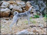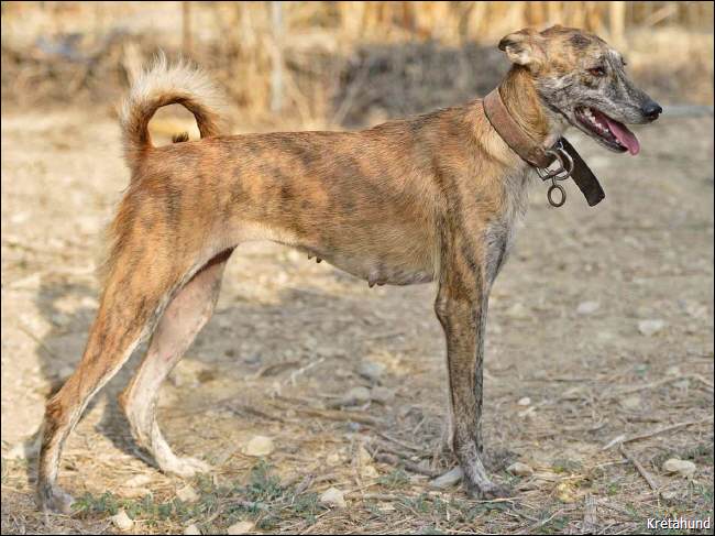 Die Rute erreicht herabgezogen nicht ganz die Sprunggelenke. Breit im Ansatz, wird sie zur Spitze hin schmaler. Sie ist in mittlerer Höhe angesetzt, wird aufwärts getragen und bildet eine Kurve, einen halben Ring oder einen Ring über dem Rücken. Wenn der Hund entspannt ist, hängt die Rute lose herab. Die Unterseite ist länger behaart. Die Rute ist ein wichtiges Rassemerkmal. Der Kritikos Lagonikos nutzt sie als Stabilisator und Ausdrucksmittel. |