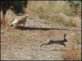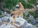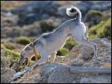 Die Hasenjagd auf Kreta stellt aufgrund der extremen Geländeverhältnisse und des Klimas besonders hohe Anforderungen an die Hunde. Die Härte und Schärfe, die sie dabei an den Tag legen, steht in krassem Gegensatz zu ihrem sonstigen Verhalten. Während der Jagsaison von Mitte September bis in den April fahren die Jäger mit einem oder zwei Hunden in abgelegene Gebirgsregionen. Gelegentlich werden zusätzlich junge Hunde zur Ausbildung mitgenommen. Die Jagd beginnt im Morgengrauen und dauert viele Stunden, oft bei Temperaturen um die 40°. Die Hunde jagen mit allen Sinnen. Der Jäger postiert sich meistens auf einem Felsen und kann von dort seine Hunde, die immer wieder Blickkontakt mit ihm aufnehmen, durch optische und verbale Signale aus großer Entfernung führen. Sie suchen mit der Nase die Spur des Hasen, der sich in Felsspalten oder im Dornengestrüpp versteckt. Dabei verfolgen sie ohne Spurlaut die frischeste Fährte, die direkt zum Versteck des Hasen führt. Die Hunde arbeiten ruhig und leise, sie dürfen bei aller Jagdmotivation nicht hektisch werden, sondern müssen sich konzentrieren, um keine Energie zu verschwenden. Die trockene Witterung, die hohen Temperaturen und der oft sehr starke Wind erschweren das Auffinden der Beute, da die Duftmoleküle, vor allem auf dem kahlen Fels, rasch zerstört werden. Ein großes Problem stellt auch der Staub dar, den die Hunde zwangsläufig mit der Nase aufnehmen und der somit Geruchssinn und Atmung beeinträchtigt und die Hunde zu häufigem Niesen zwingt. Der Kritikos Lagonikos verfügt jedoch über eine Jagdtaktik, die von den Kretern "Anemistos" genannt wird. Es bedeutet "mit dem Wind - Erfassen der Luft". Dazu bleiben die Hunde stehen, nehmen die Nase hoch, stellen sich manchmal auch auf die Hinterbeine und bewegen sich gegebenenfalls im Kreis. Sie saugen den Geruch der Beute mit Nase und oft leicht geöffnetem Fang ein und orten so die Beute. Man kann gut sehen, wie sie dabei die "Backen aufblasen" und den Geruch regelrecht "kauen". Eine weitere erfolgreiche Taktik besteht im Belecken des Untergrundes, um die wenigen noch vorhandenen Reste der Fährte besser aufnehmen zu können. Am lebhaften Rutenspiel der Hunde erkennt der Jäger, wenn sich die Beute in unmittelbarer Nähe befindet. Mit gespitzten Ohren lauschen sie auf jede Regung ihres Opfers. Währenddessen kommunizieren die Hunde über ihr Rutenspiel miteinander, und das plötzliche Erstarren eines Hundes, mit hoch aufgeringelter Rute, zeigt dem Jäger, daß das Versteck gefunden wurde. Wenn der Hase aufgejagt worden ist, beginnt die Hatz über scharfkantige Felsen und dornigem Bewuchs, wobei kurz der "Kampfschrei", ein hohes Bellen, zu hören ist. Dabei vollführen die Hunde atemberaubende Sprünge und Wendungen, um dem hakenschlagenden Hasen den Weg abzuschneiden. Oft müssen tiefe Schluchten und meterhohe glatte Felswände überwunden werden. Mit Eleganz und Leichtigkeit bewegen sich die Hunde in dem schwierigen Gelände und erreichen dabei auf kurzen Distanzen Geschwindigkeiten von ca. 70 km/h. Die Hunde arbeiten miteinander und die Erfahrung lehrt sie "wie der Hase läuft". Wenn es ihnen nicht gelingt, den Hasen auf den ersten 100 metern im Lauf zu packen, verfolgen sie ihn noch ca. 500 bis 1000 meter und kehren dann zum Jäger zurück. Die Hunde wissen aus Erfahrung, dass ihre Chancen mit der Entfernung geringer werden und begeben sich auf eine neue Suche. Wenn ein Hund die Beute gefasst hat, apportiert er sie seinem Herrn, ohne daß die anderen Hunde versuchen, sie ihm streitig zu machen. Die traditionelle Jagdweise ohne Gewehr ist heute nicht mehr erlaubt. Die Jäger müssen über viel Erfahrung und gutes Timing verfügen, um den Hund beim Schuß nicht zu verletzen, da dieser sich sehr nah hinter der Beute befindet, und oft hat der Hund den Hasen bereits gefangen, bevor der Jäger die Möglichkeit zum Schuß hat. |