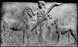 Artemis war die jungfräuliche Jägerin. Wer auch nur den Versuch machte, sie zu erobern, bekam ihre Rache zu spüren. So wurde der kretische Jäger Siproites in eine Frau verwandelt, nachdem er Artemis beim Baden beobachtet hatte. Für das gleiche Vergehen wurde Aktaion, der vom Kentauren Chiron zum Jäger erzogen worden war, von der Göttin in einen Hirsch verwandelt. Sie hetzte seine eigenen fünfzig Jagdhunde auf ihn, die ihn in Stücke rissen. Der Dichter Ovid nennt uns in seinem Gedicht über Aktaion Namen und Herkunft der Hunde: Der weise Ichnobates (Spürhund), ein Kretischer Jagdhund; Melampus (Schwarzfuß), aus Spartischer Zucht; Dorceus, Pamphagus und Oribasos aus Arkadien; Nebrophonos, Theron, Lailaps und Pterelas sind unübertroffen in ihrer Schnelligkeit; Agre (Jäger) zum Aufspüren; Hylaeus (Waldmann), kürzlich von einem Bären verwundet; Nape, eine schlanke Hündin, deren Vater ein Wolf war; Poemenis; Harpyia Sicyonius; Ladon; Dromas; Canache; Tigris; Sticte; Alce; Asbolos; Leucon; Lycisce; Cyprius; Lacon; Aello; Thoos; Melaneus; Harpalos; Labros und Argiodus hatten einen Kretischen Vater und eine Spartische Mutter; Hylactor; Melanchaetes; Theridamas; Oresitrophus und einige mehr. |